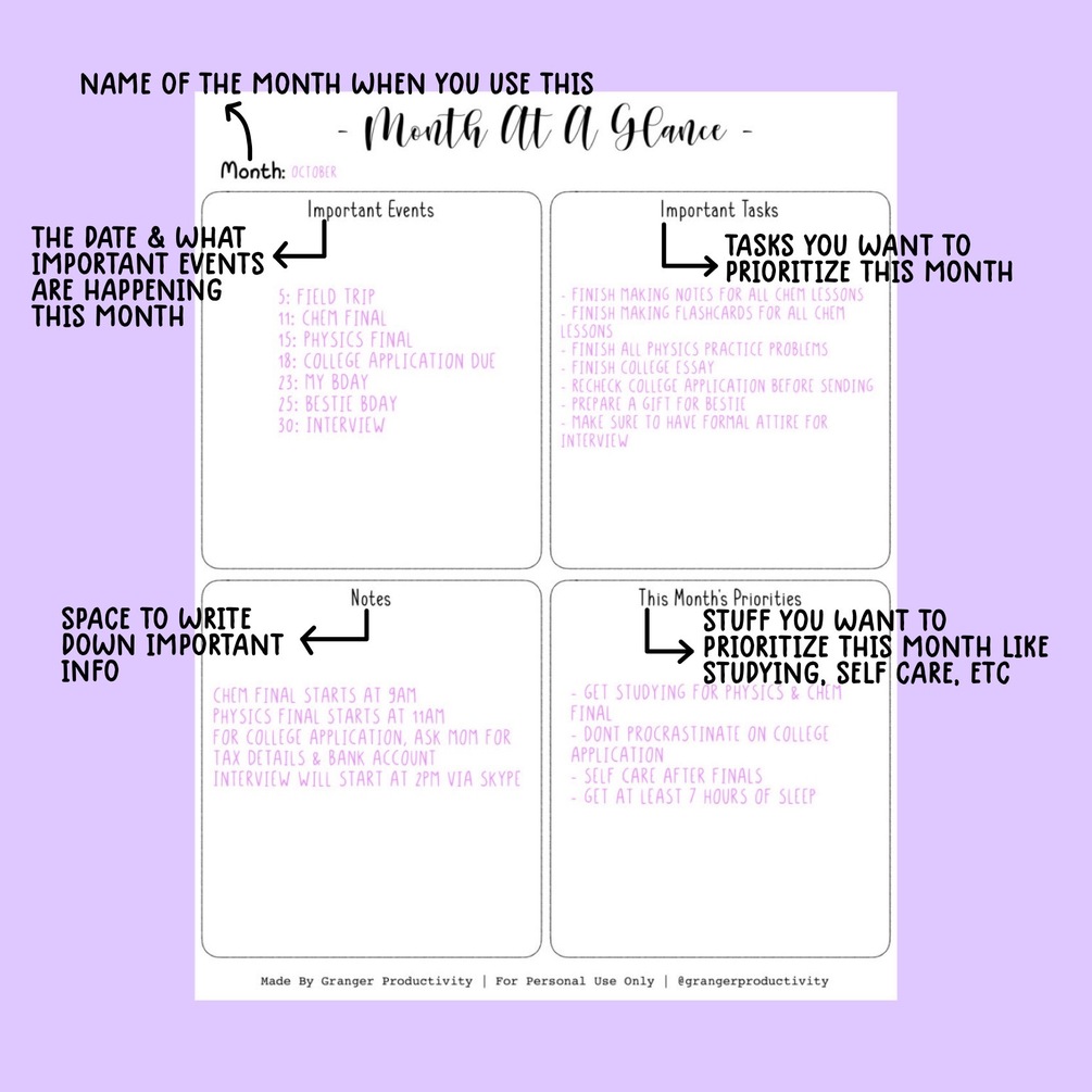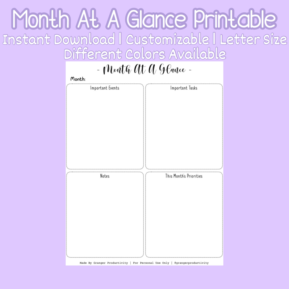 Start planning for the month ahead with this year at a glance printable. This printable will help you organize your life & your upcoming projects. Note your important dates & events, start prioritizing what you want to do this month & note what tasks you plan to get done this month. The good thing about this is that it is undated so you can keep using it for years to come!