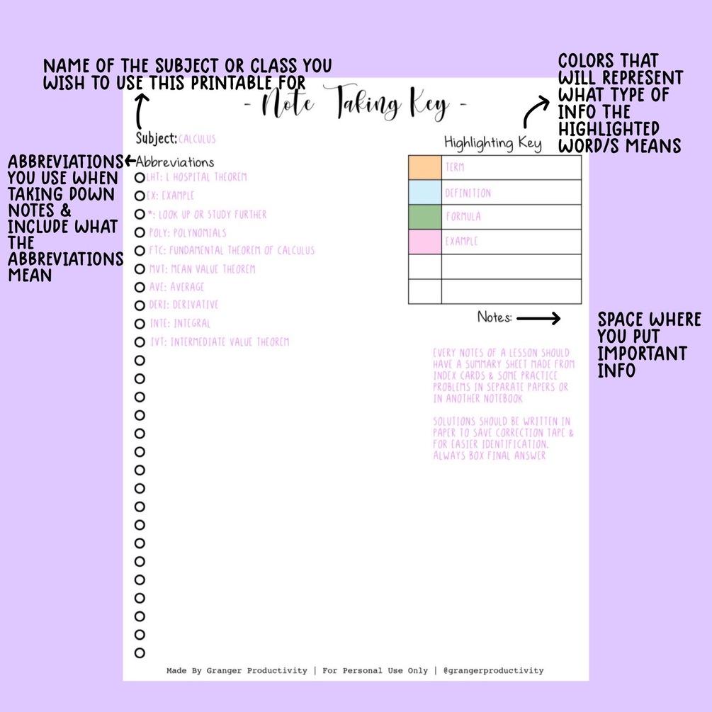 NoteTaking Key Printable | Digital | Notebook | Student College | Abbreviations | Academic Planner | Student Planner | Notes | Guide | School | Template | Instant Download