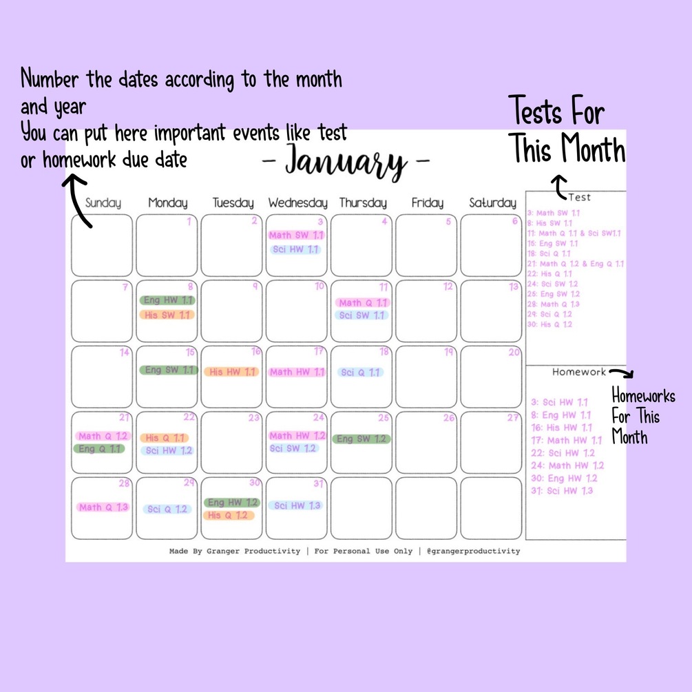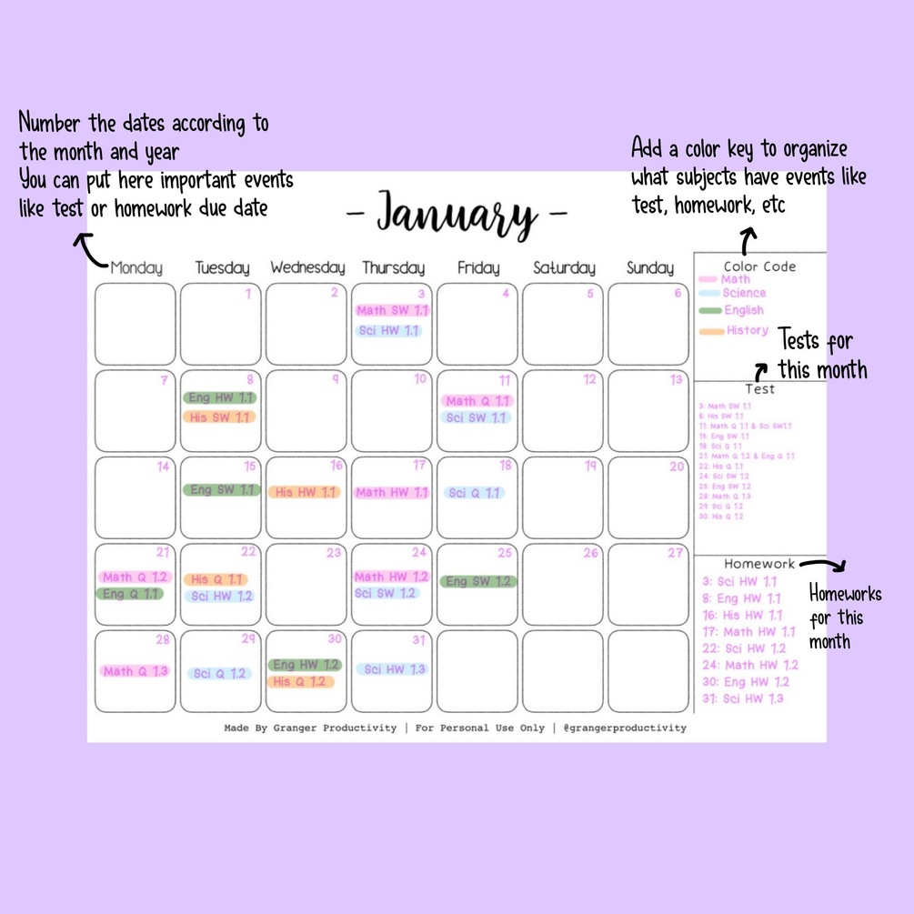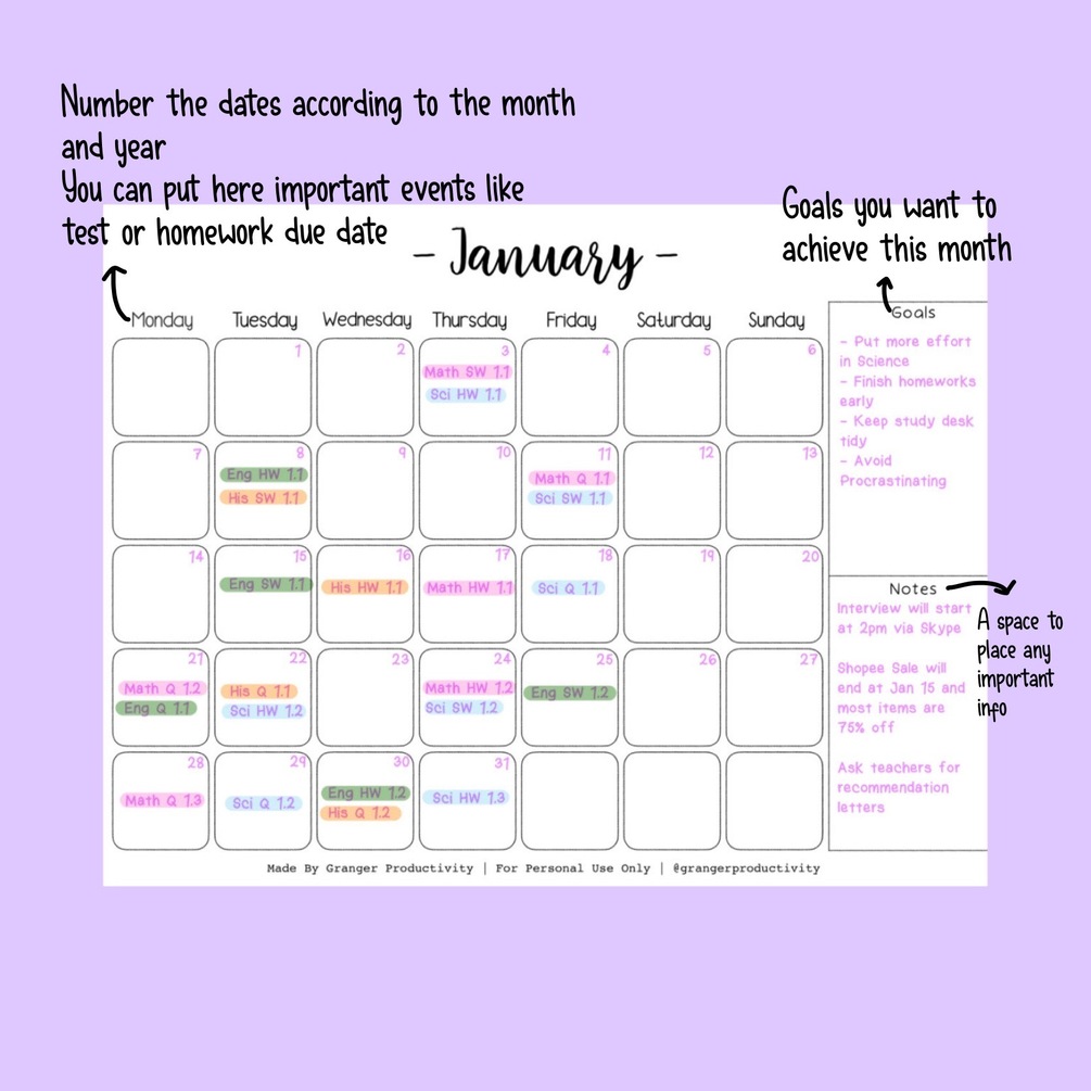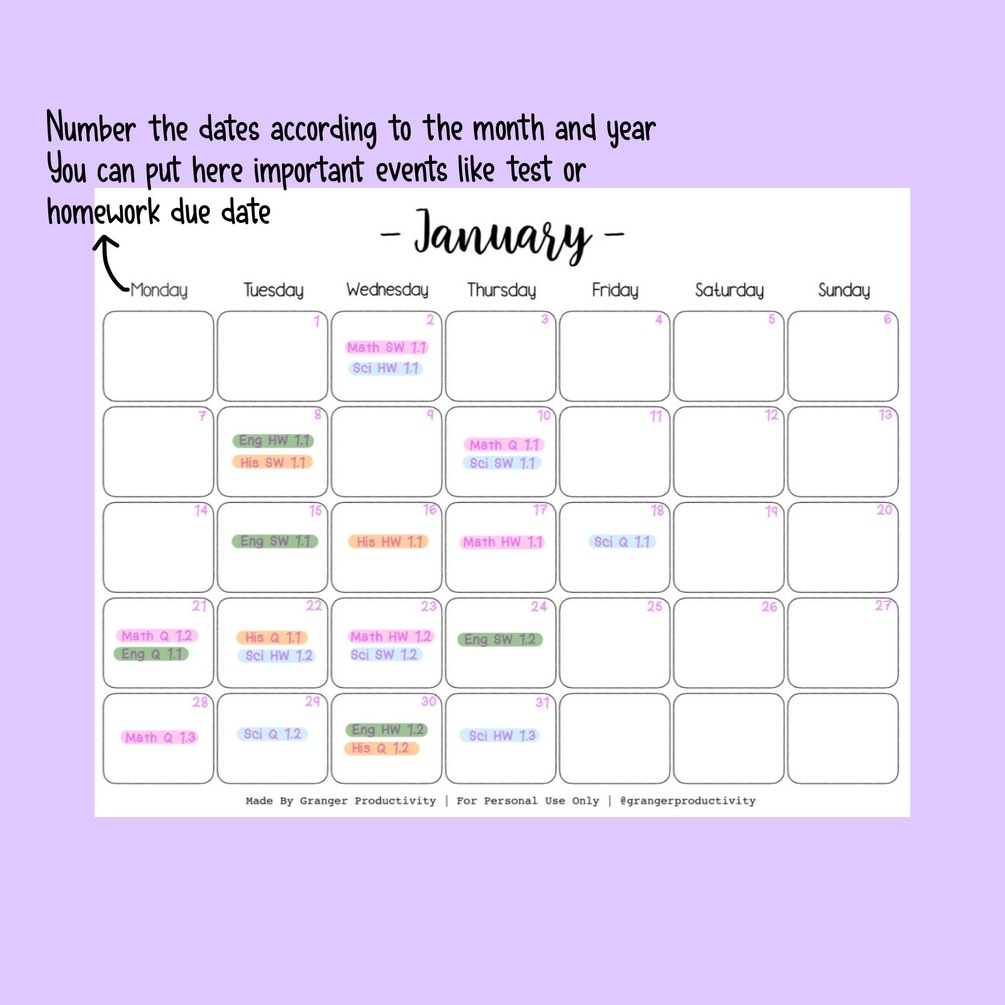 Undated Monthly Planner Printable | Students | College | High School | Academic Planner | Student Planner | Monday and Sunday Start | Discbound and Planner Insert | Planner | Organization | Productivity | Monthly Student Agenda | Instant Download
