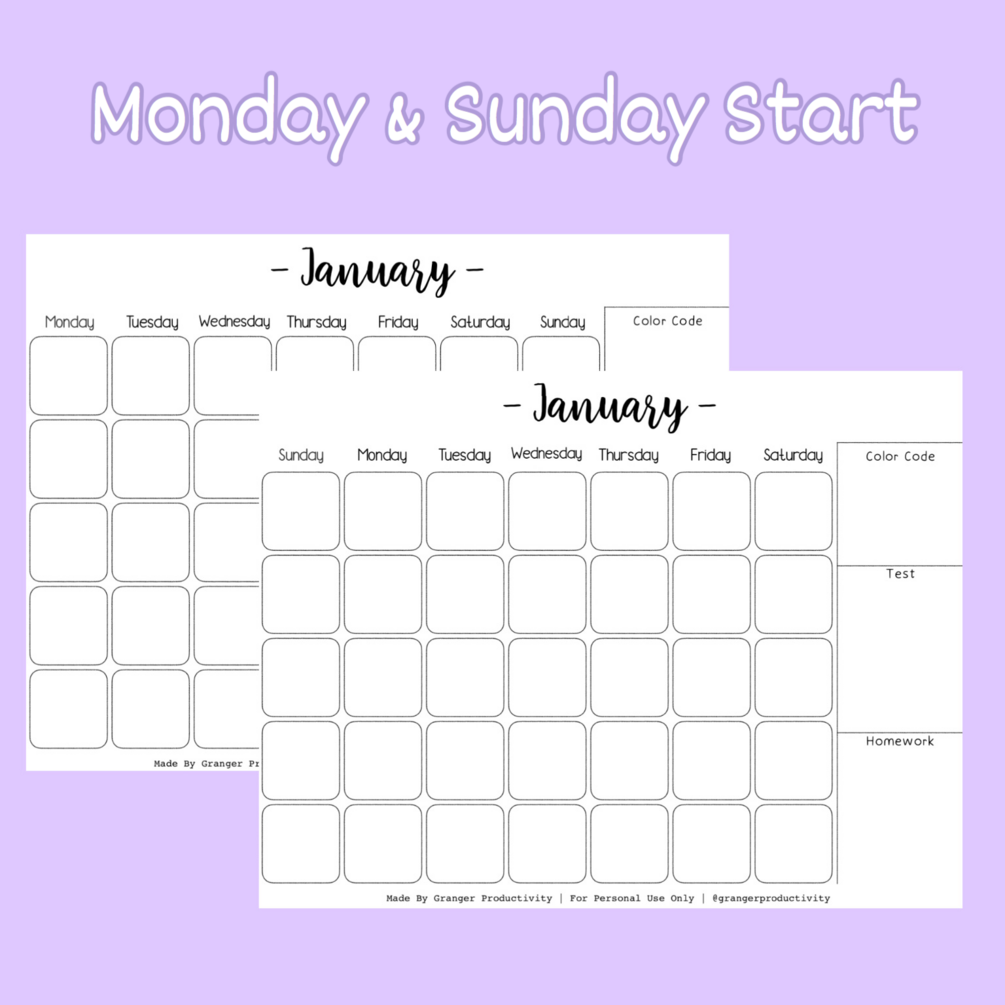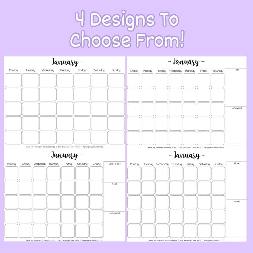 Get an overview of the month & be organized with these monthly printables. With 4 different designs to choose from, you will surely be able to find the one that is perfect for you! These planners have a Monday and Sunday start to suit your needs. These planners are very spacious giving you enough space to write down all of your events. Never miss another due date again with these planners